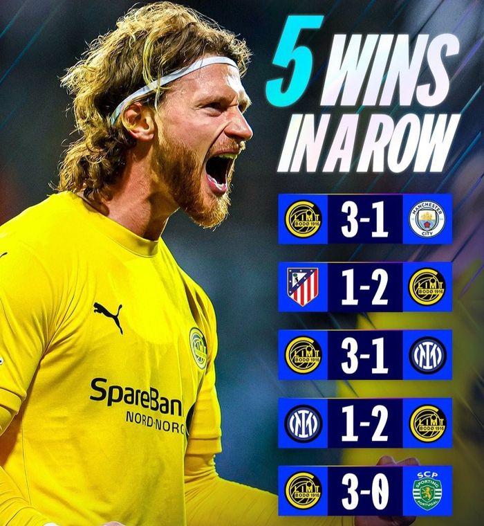 最近欧冠5场比赛,博德闪耀全部取胜,具体比分如下:3-1击败曼城,客场2-1打败了马竞,主场3-1击败了国际米兰,客场2-1再胜国际米兰,主场3-0打败了葡萄牙体育。曼城是世界级豪门,也是欧冠夺冠热门,尤其拥有世界级前锋哈兰德,整体实力非常强。马竞虽不是世界级豪门,但也是欧冠常客、西甲强队。国米是上赛季欧冠亚军,也是世界级豪门。